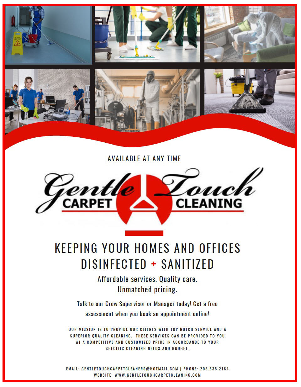 Gentle Touch Carpet Cleaning is a Family owned and operated business. We have been serving the Birmingham and surrounding areas since 2001. We specialize in Residential and Commercial Carpet and Tile and Grout Cleaning. We also offer Upholstery and Water Damage Restoration.