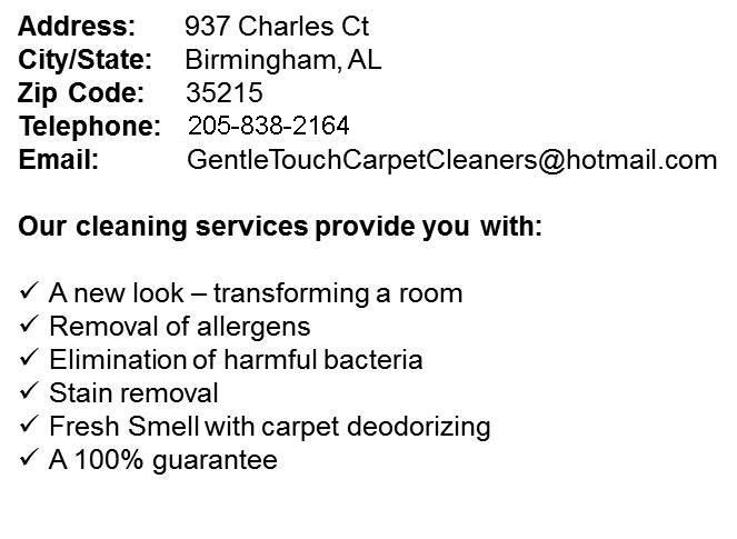 Gentle Touch Carpet Cleaning is a Family owned and operated business. We have been serving the Birmingham and surrounding areas since 2001. We specialize in Residential and Commercial Carpet and Tile and Grout Cleaning. We also offer Upholstery and Water Damage Restoration.